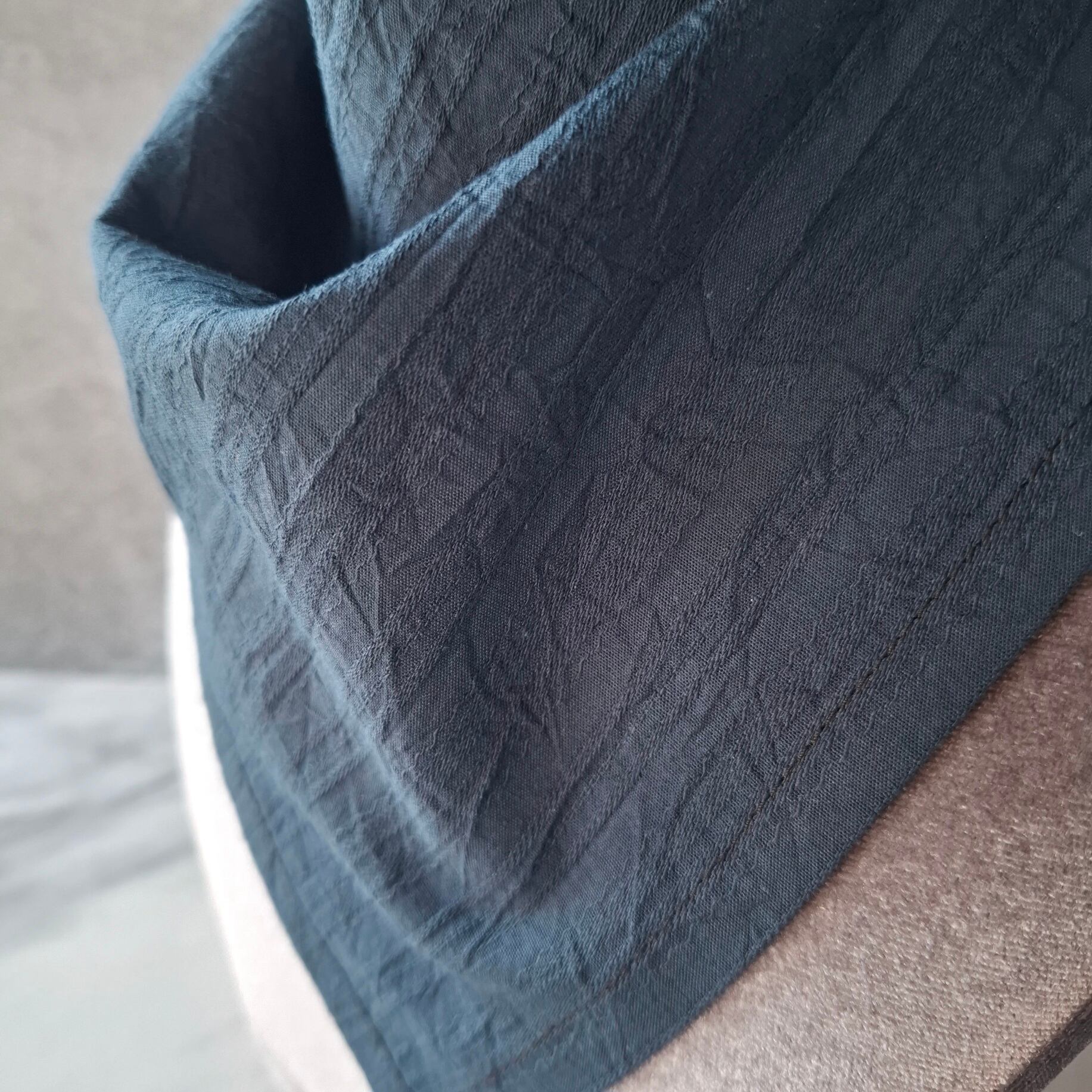 このスカーフは一重仕立てで通気性がよく、形も整いやすい設計。